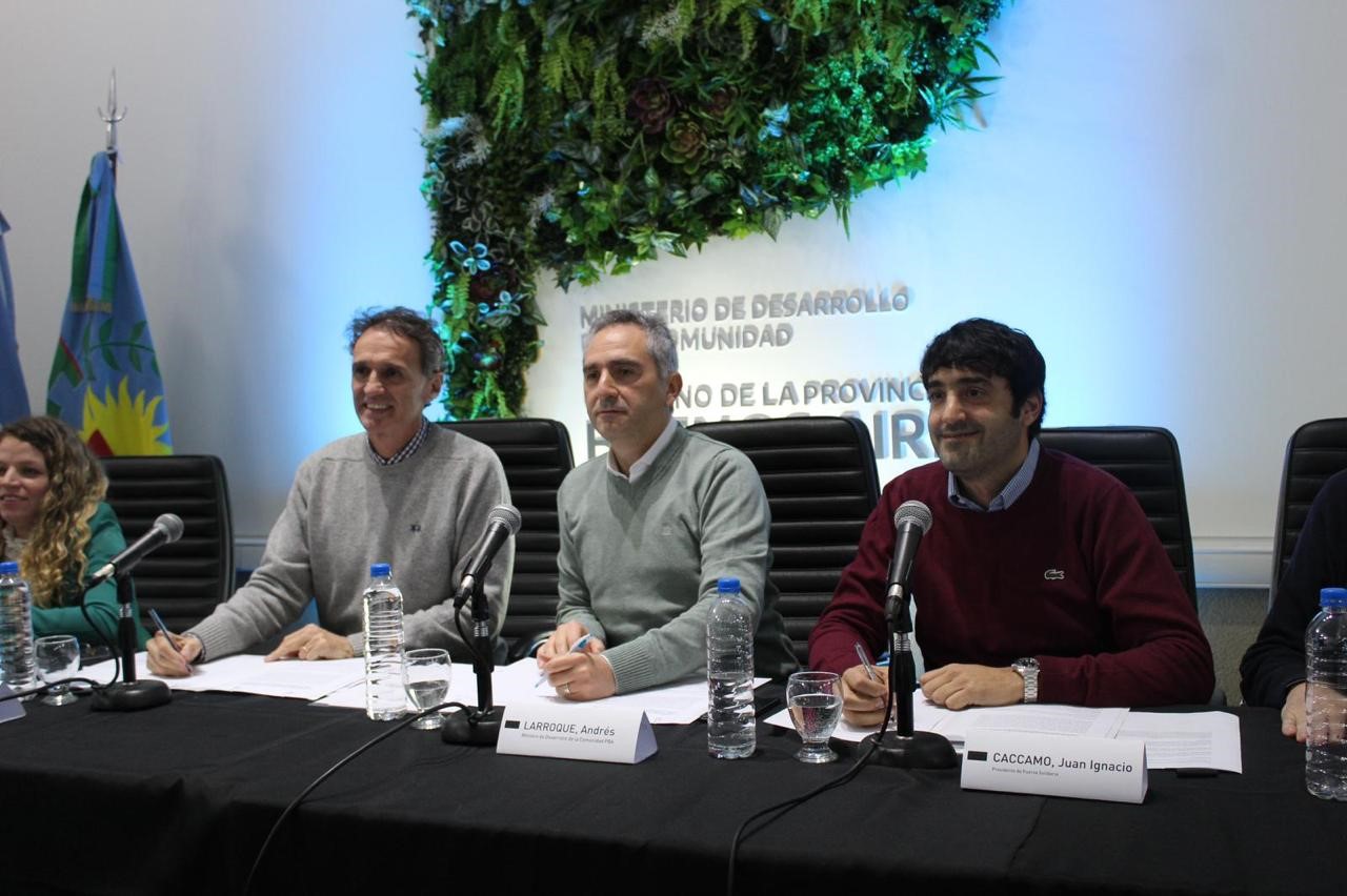 En La Plata, se firmó días atrás un convenio de colaboración entre el Ministerio de Desarrollo de la Comunidad de la Provincia de Buenos Aires, representado por Andrés Larroque, el Ministerio de Infraestructura y Servicios Públicos de la Provincia de Buenos Aires, encabezado por Gabriel Katopodis y el Fideicomiso Fuerza Solidaria, representado por su presidente, Juan Ignacio Cáccamo.