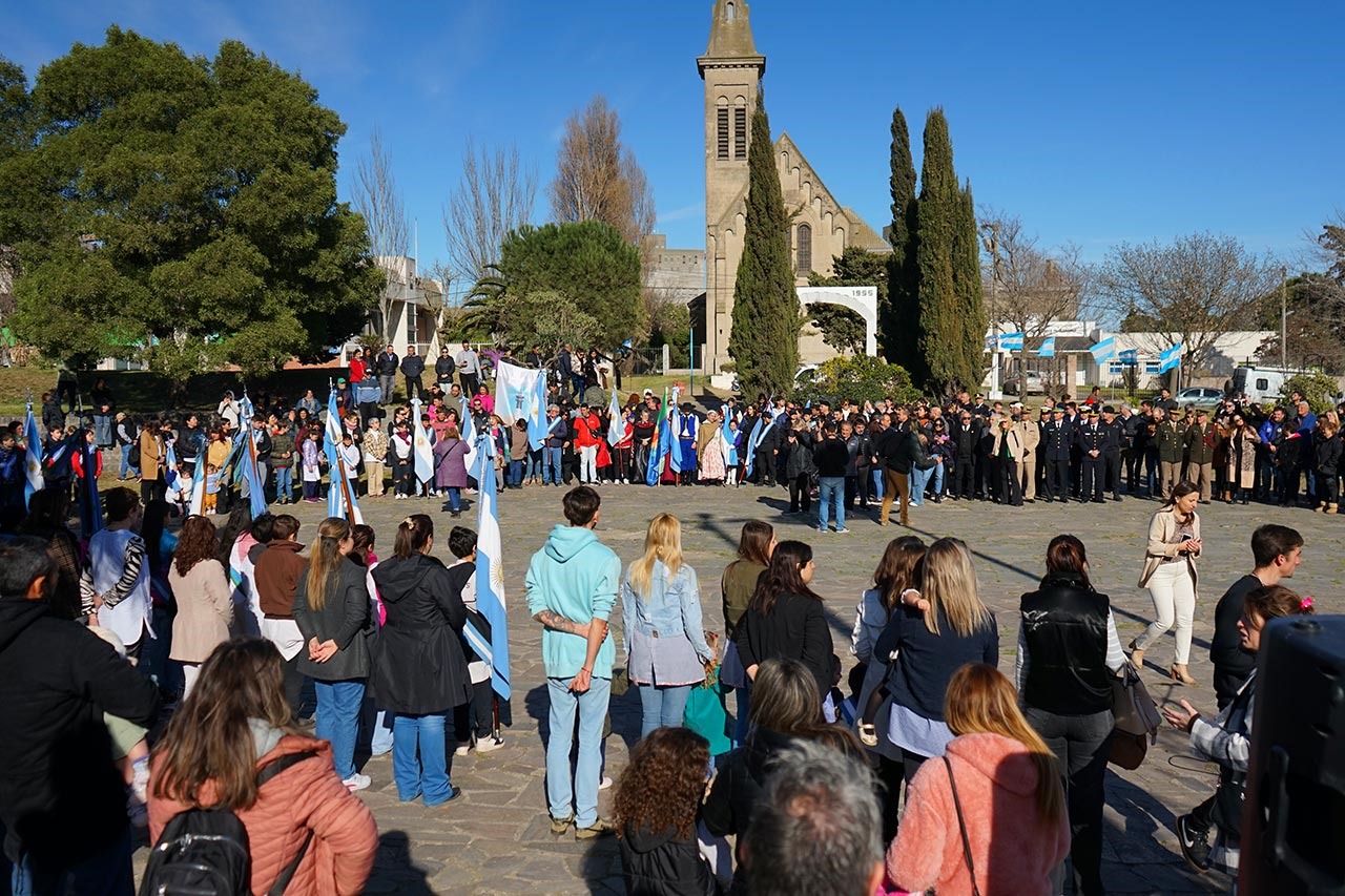 Entre las banderas de ceremonia de las instituciones educativas, una hermosa versión del Himno Nacional Argentino y la bendición parroquial de La Merced con el cura Hernán Gómez Syez, las palabras alusivas estuvieron a cargo de la delegada municipal de Quequén, Silvia Jensen; y el Intendente Arturo Rojas, quienes llamaron a seguir trabajando en conjunto entre toda la comunidad para lograr la reparación histórica de Quequén.
